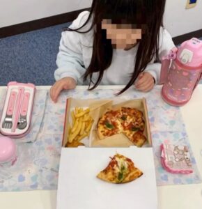 ピザが届くと、事前に自分で選んだピザをみんなで「いただきます!」。