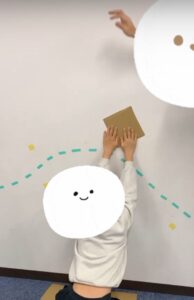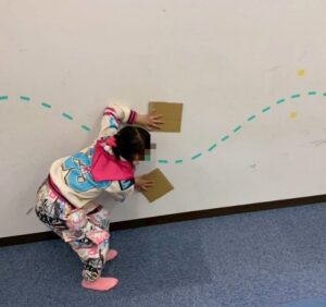 壁に描かれた曲線に合わせて、子どもたちは両手で正方形の段ボールをそっと持ち、ゆっくりとなぞっていきます。
