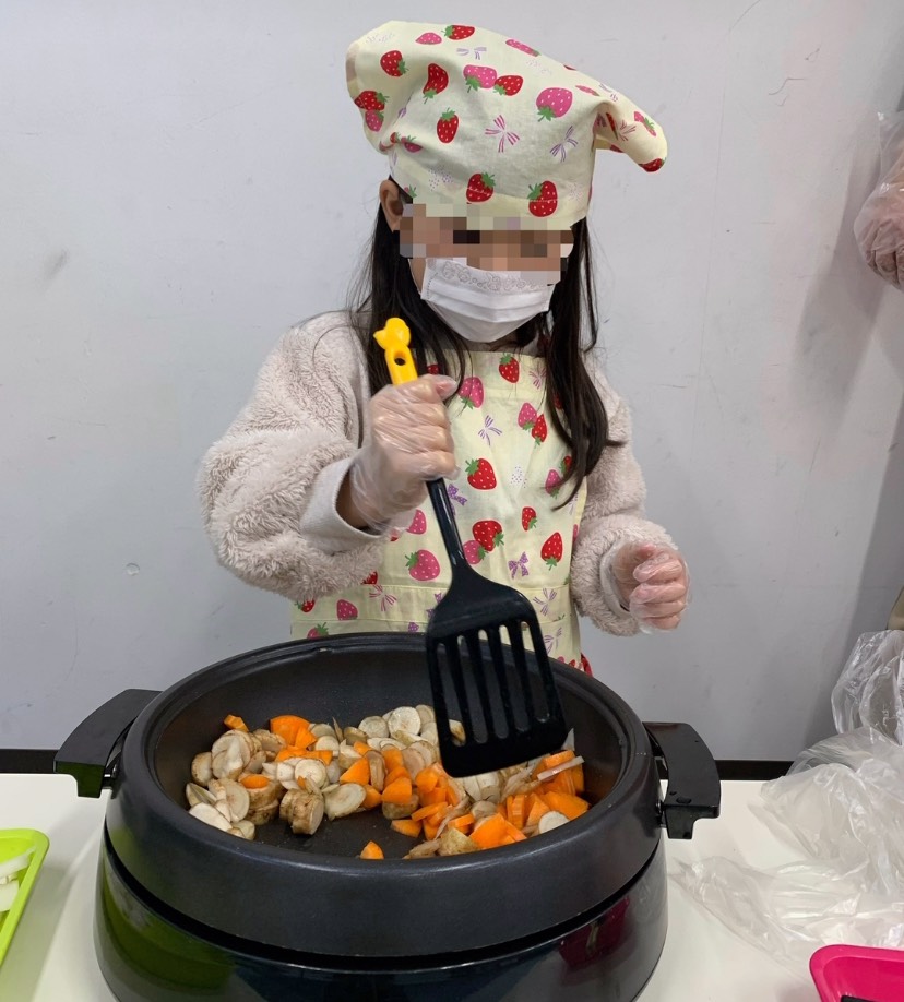 豚汁づくりでは、たっぷりの野菜・お肉・豆腐をみんなで切ってお鍋に入れていきます🥕🍖